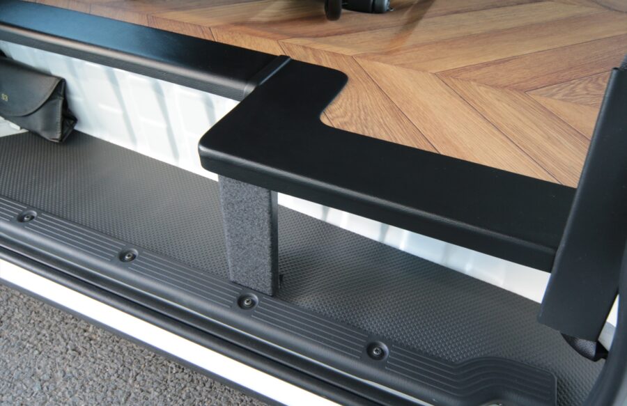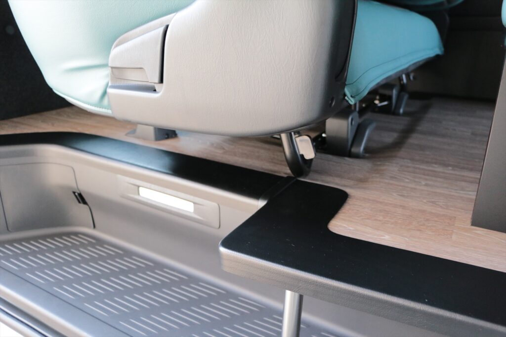 ハイエースのスライドドアを開けて乗り降りする部分のフロア形状は、『ステップハーフ加工』にすることで、乗降りもしやすく、床面積を広げることができ1番人気です。