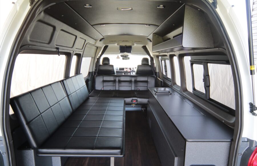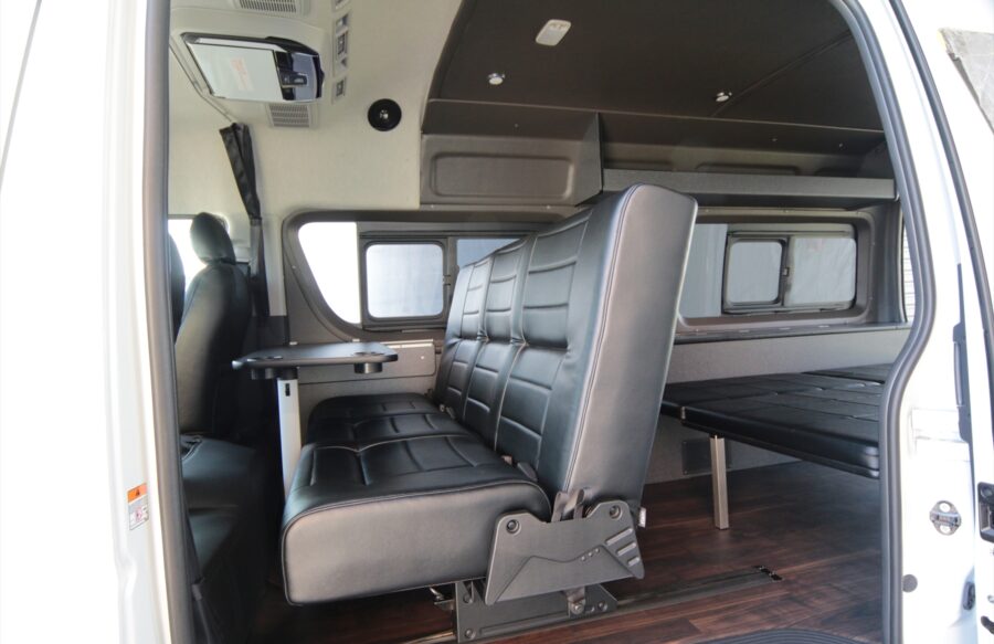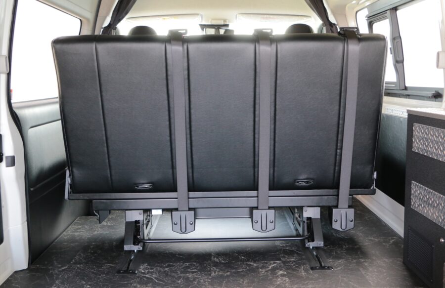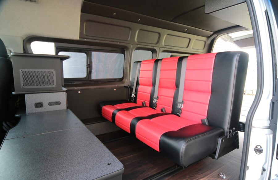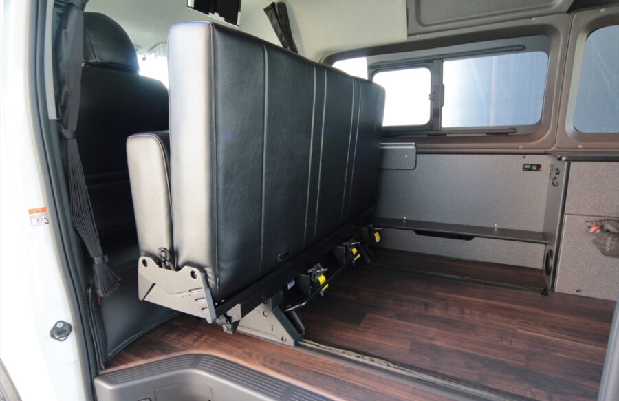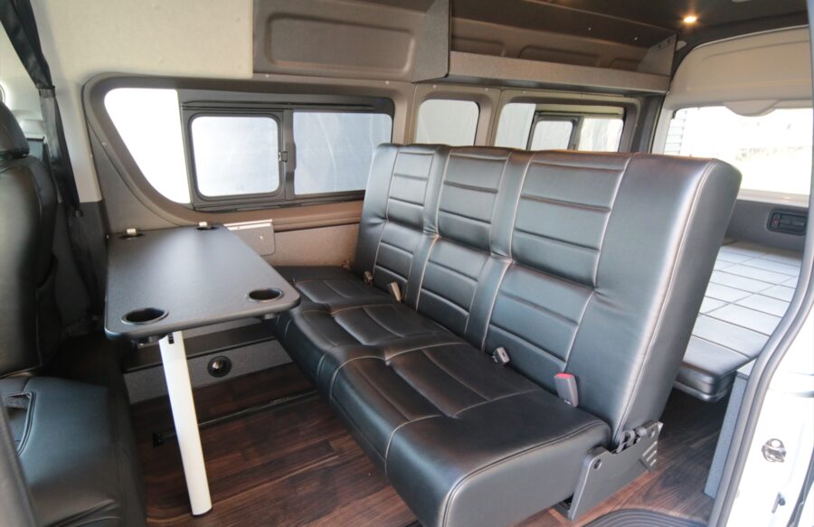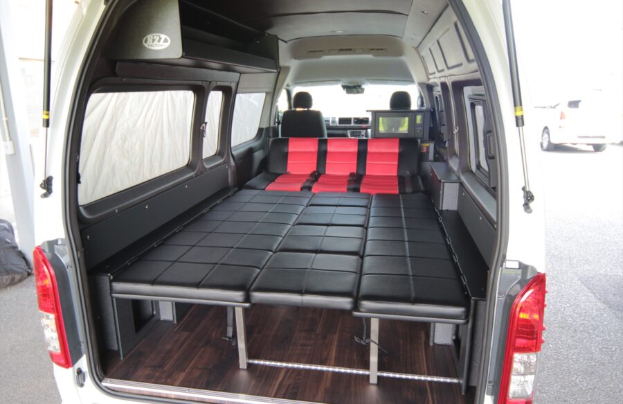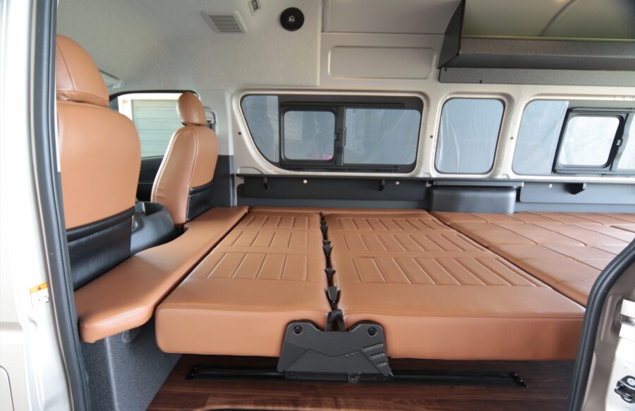 後部のベッドをシートと同じ高さで製作することで、フロントシート後部からリアゲートまで広大なベッドを造ることが可能になります。