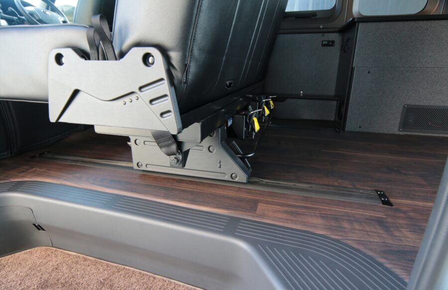 床にスライドレールを埋め込み、スライドレールの上をシートが前後にスライドします。