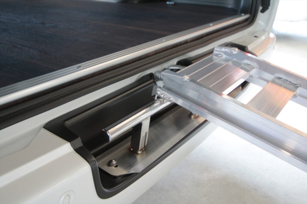 200系ハイエース用のラダーレールフックは、通常はリアゲートの開閉に干渉しないよう折りたたんでおきます。